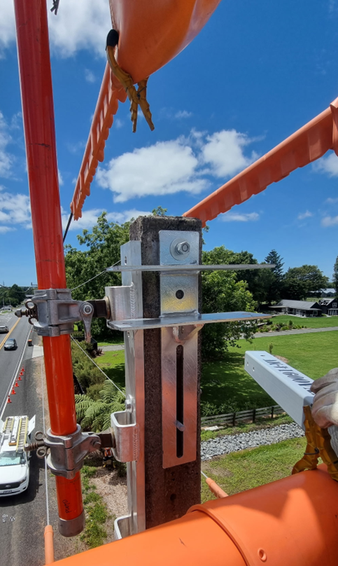 • Working with an engineering firm, we designed a new bracket that allows us to use a glove-and-barrier mast to install composite crossarms